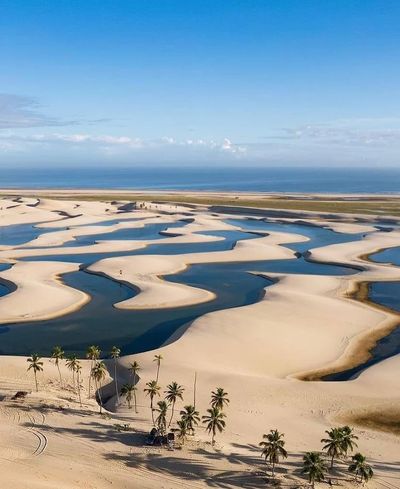 Os Pequenos Lençóis começam praticamente ao redor do vilarejo. Campos de dunas intercalados por lagoas sazonais de água doce formam o cenário do dia a dia local. O acesso varia entre carro 4x4, quadriciclo, caminhada ou downwind de kitesurf. É o passeio mais próximo e flexível — ideal para amanhecer, pôr do sol ou sessões entre as marés.